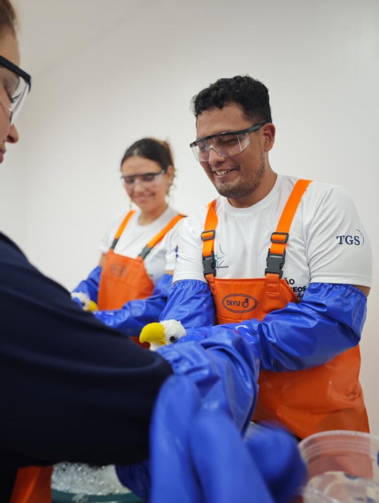 Durante o curso, realizado nos dias 18 e 19 de novembro, aprendemos técnicas e protocolos essenciais para o atendimento de animais afetados por derramamentos de óleo — uma preparação importante para atuar em possíveis emergências.